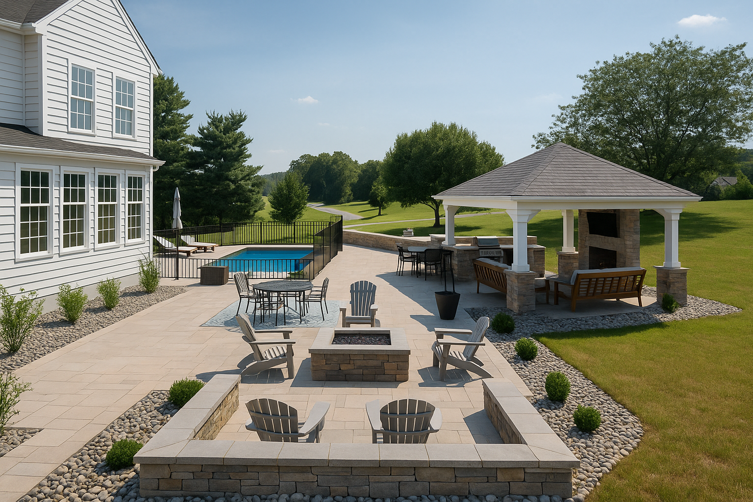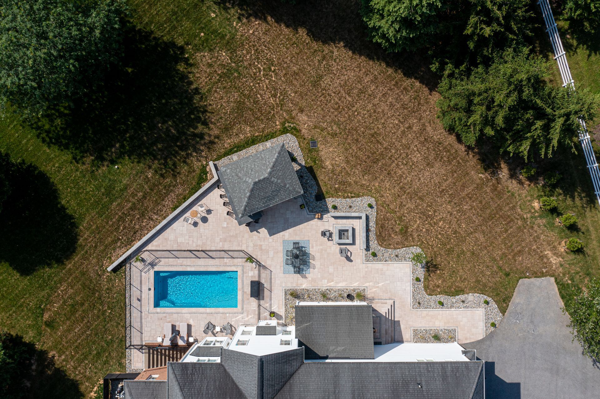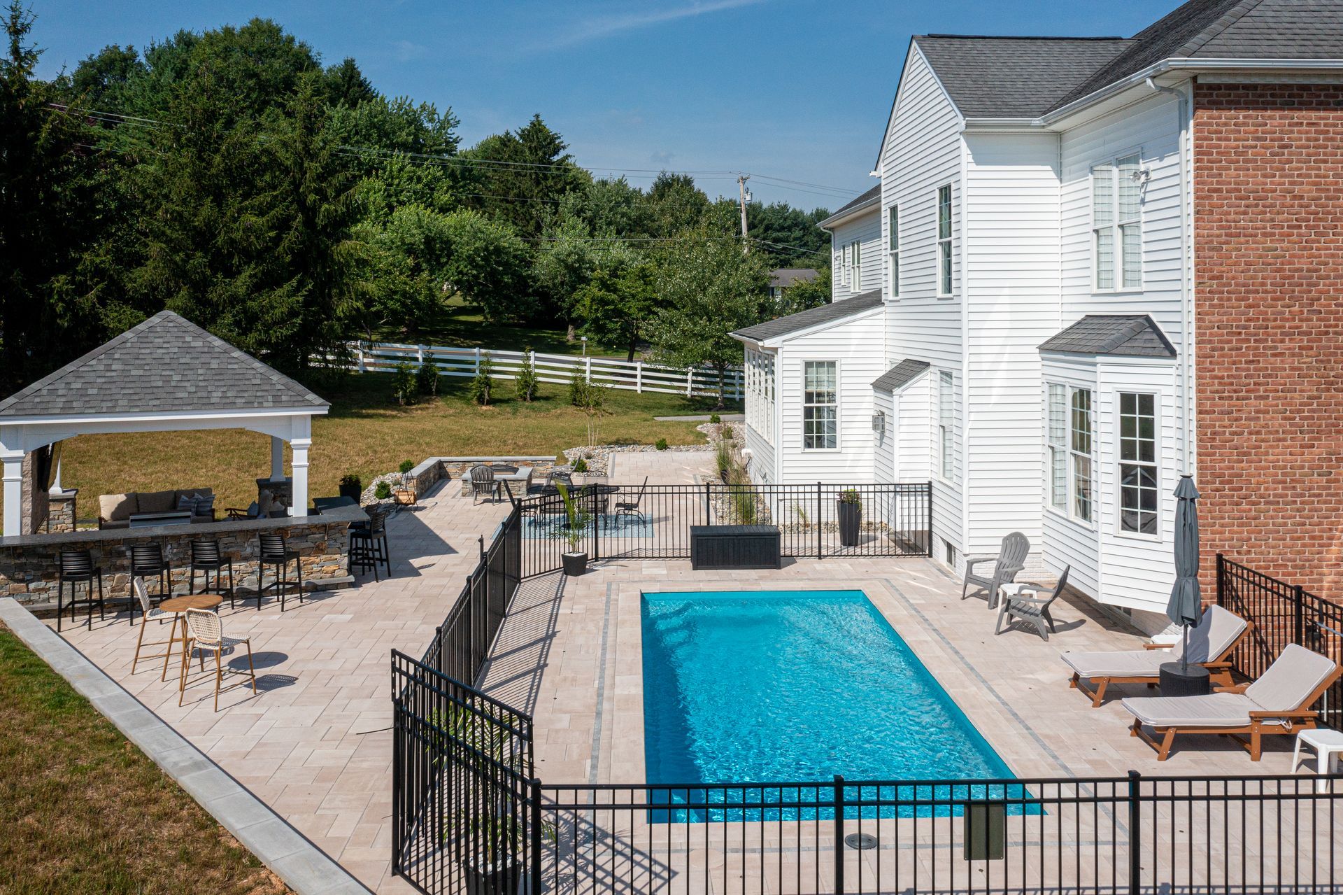 This outdoor oasis in Finksburg, Maryland broke ground in the summer of 2024, with final photos and video captured in 2025 after the landscaping had fully settled in. The homeowner wanted a true at-home retreat, especially now that working from home meant enjoying the outdoors throughout the summer.