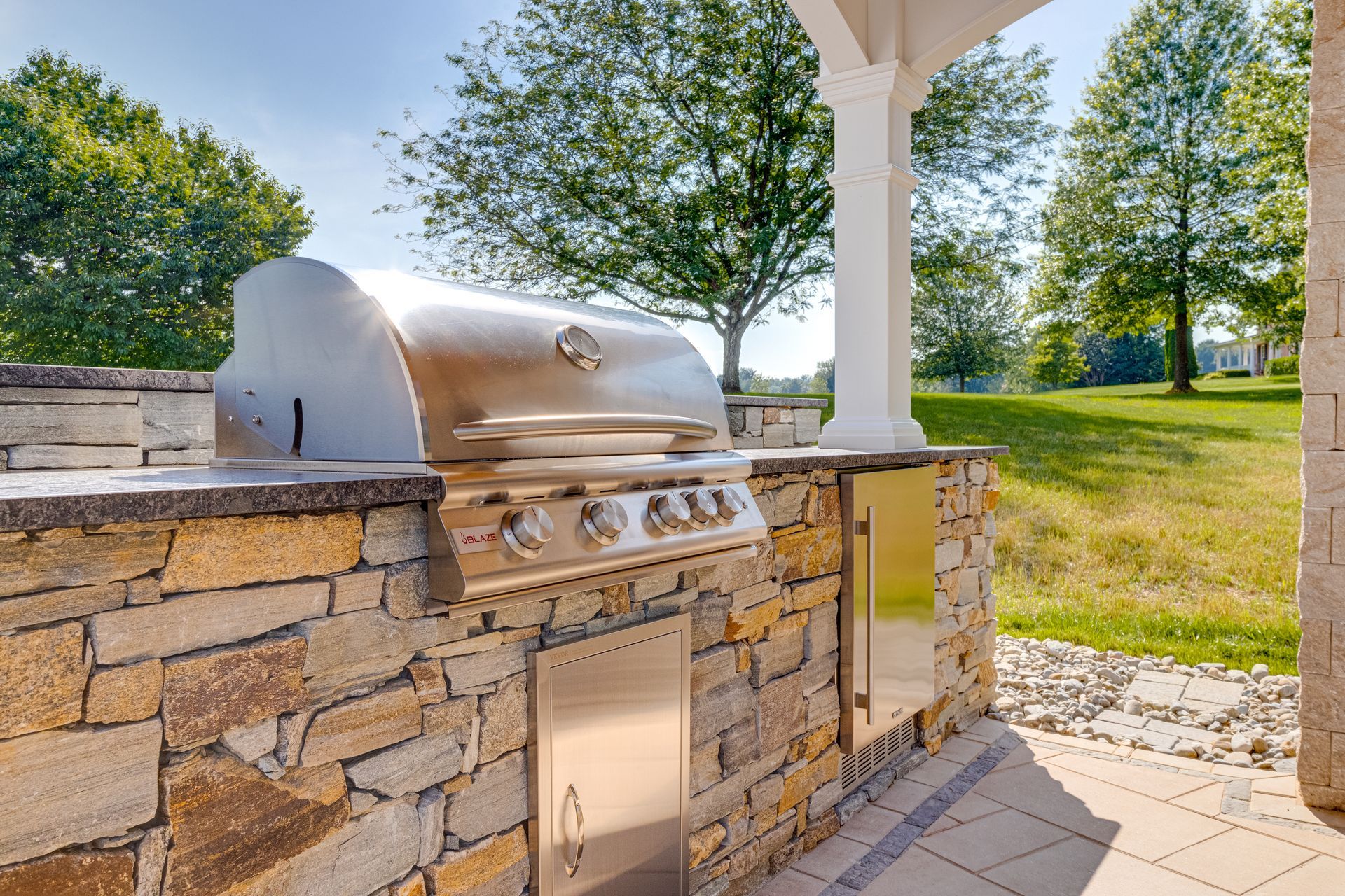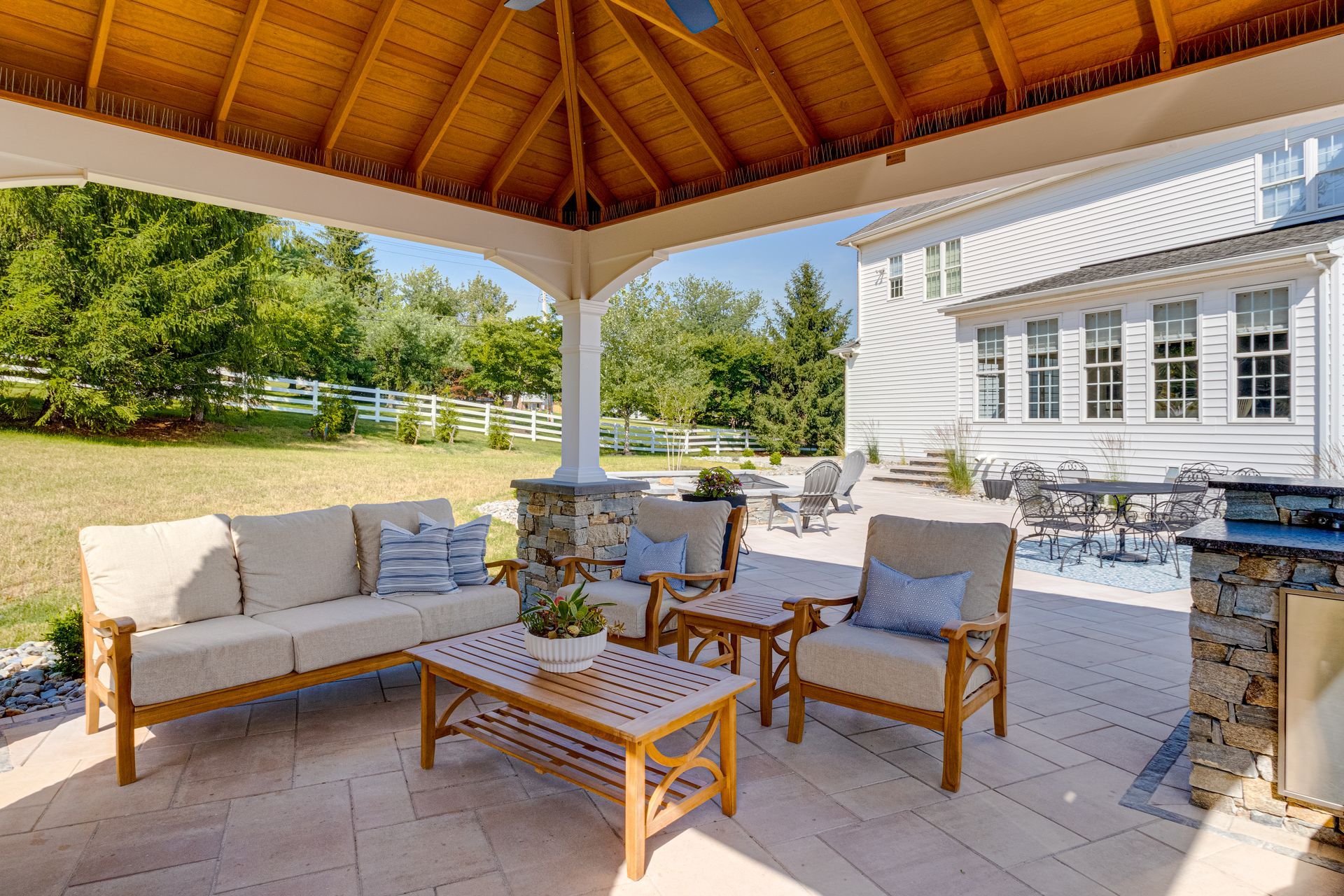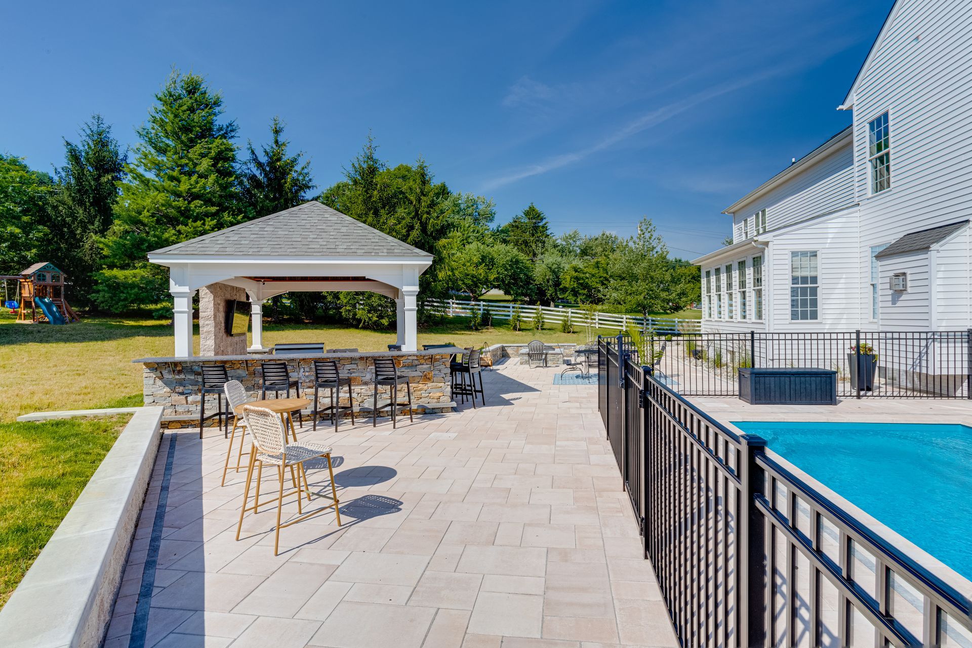 This outdoor oasis in Finksburg, Maryland broke ground in the summer of 2024, with final photos and video captured in 2025 after the landscaping had fully settled in. The homeowner wanted a true at-home retreat, especially now that working from home meant enjoying the outdoors throughout the summer.