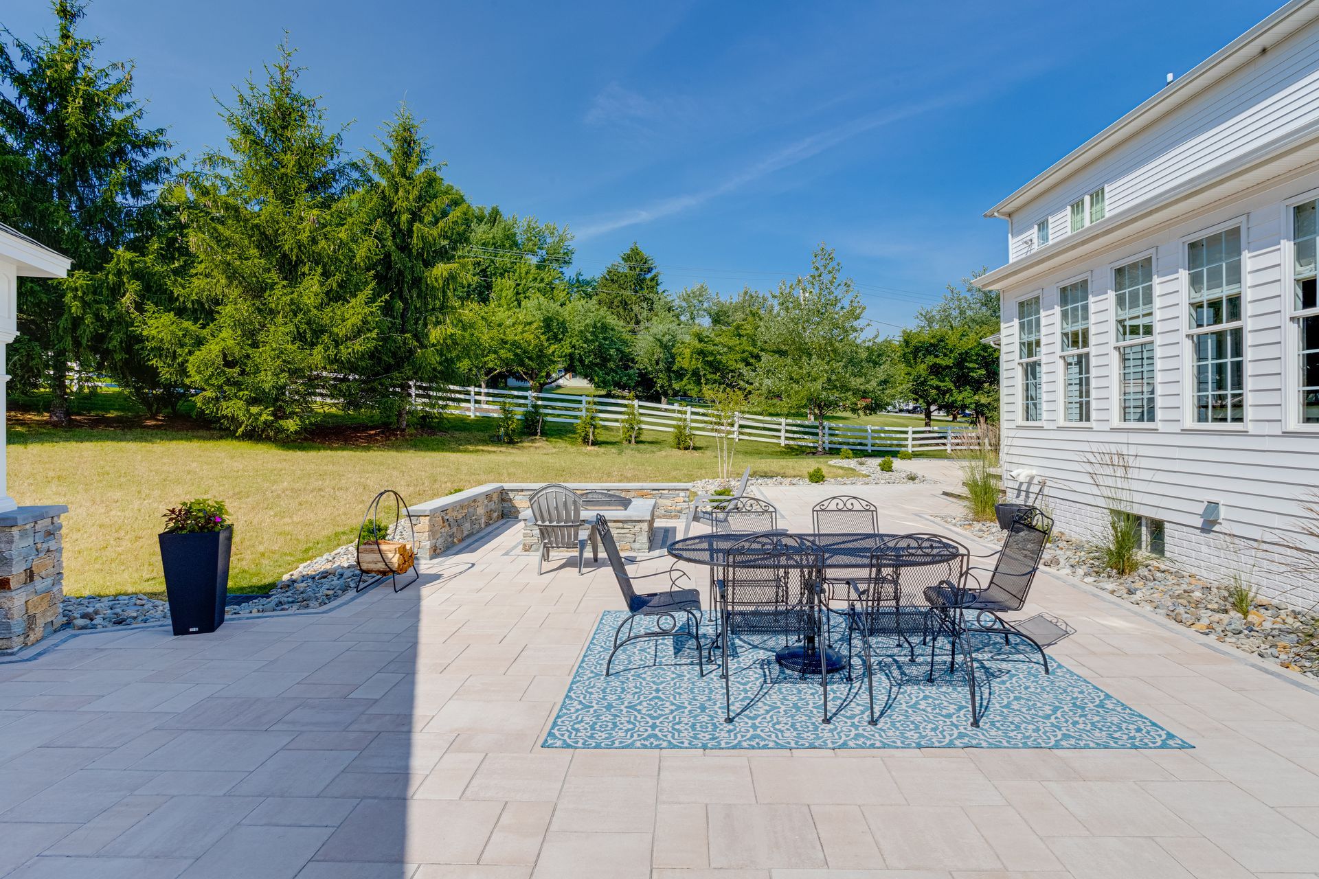 Toward the entryway of the project, the team added a bonus fire pit with a sitting wall, creating an additional gathering spot. The space is finished off with an extensive walkway system that wraps seamlessly around to the front of the home, tying the entire property together.
