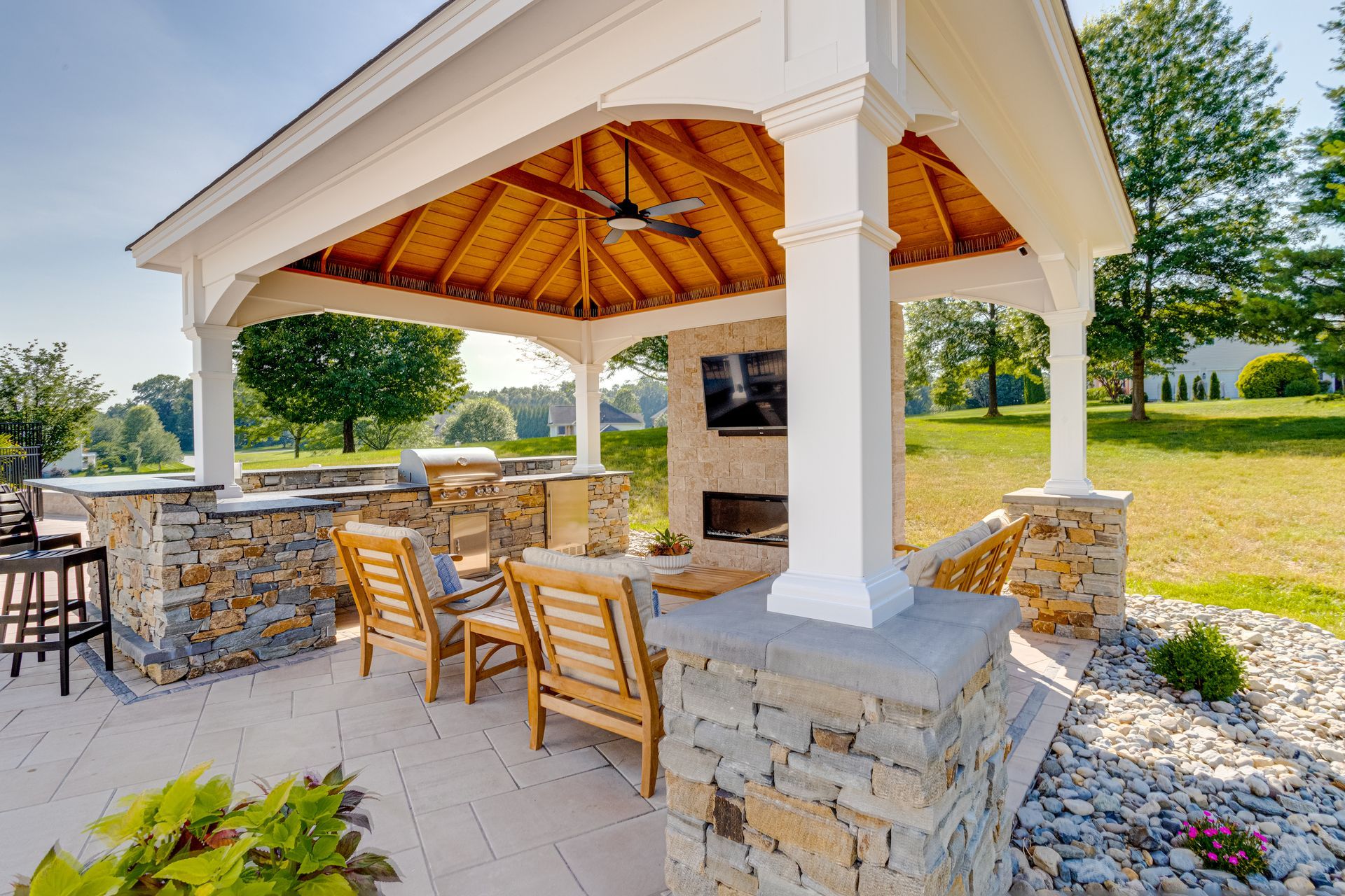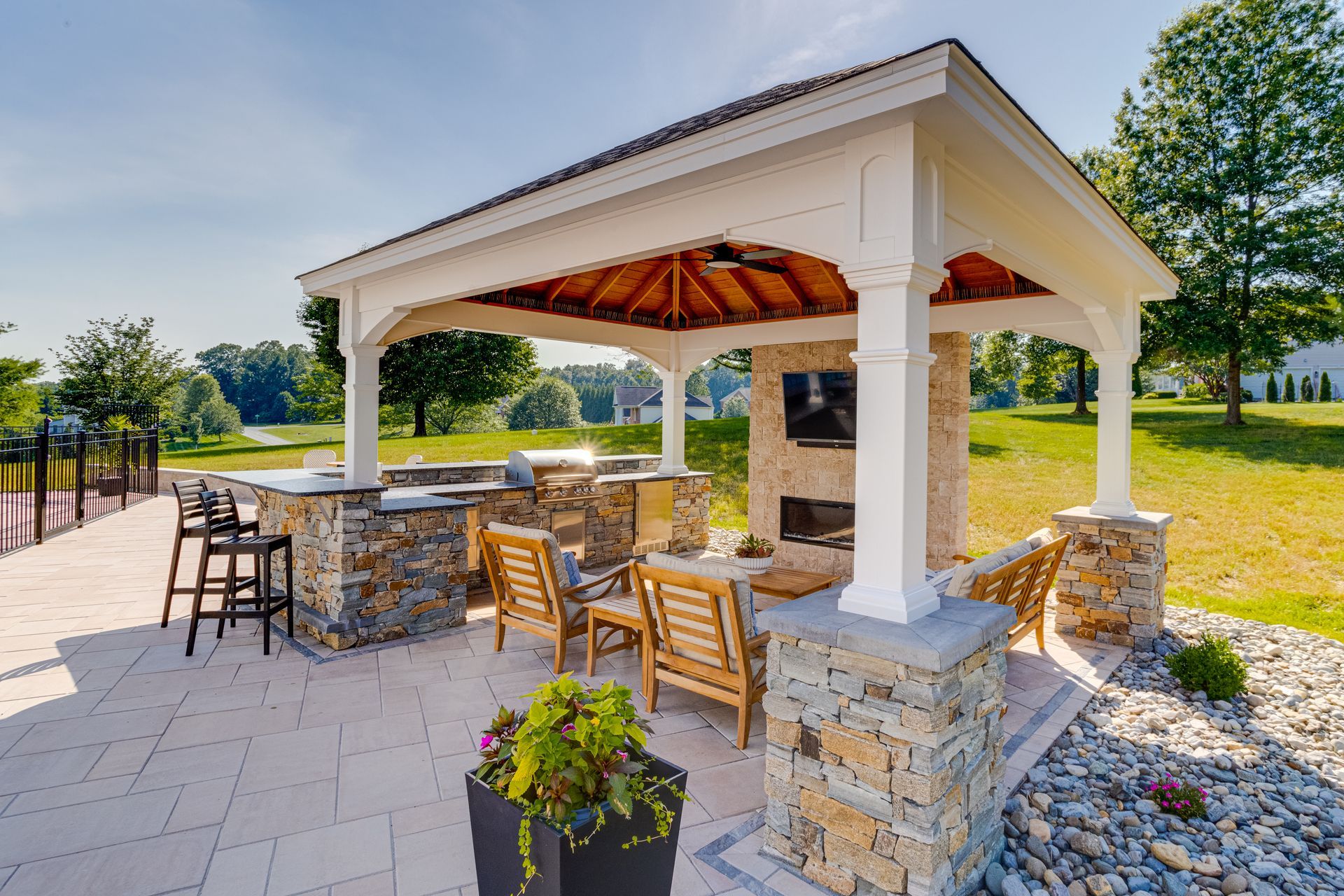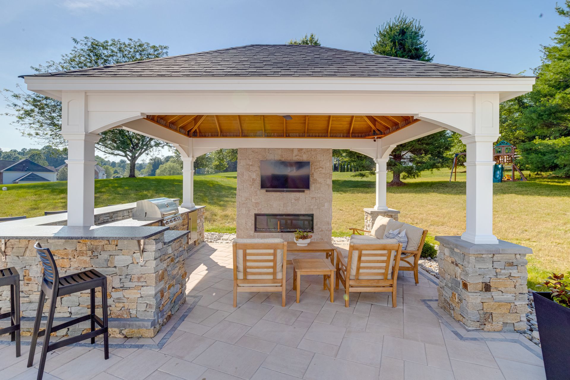 A stylish pergola creates a shaded outdoor living area complete with a built-in grill, mini fridge, bar, and an electric fireplace set into a beautiful stone TV wall—perfect for outdoor dining, lounging, and year-round enjoyment.